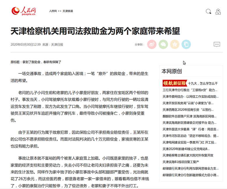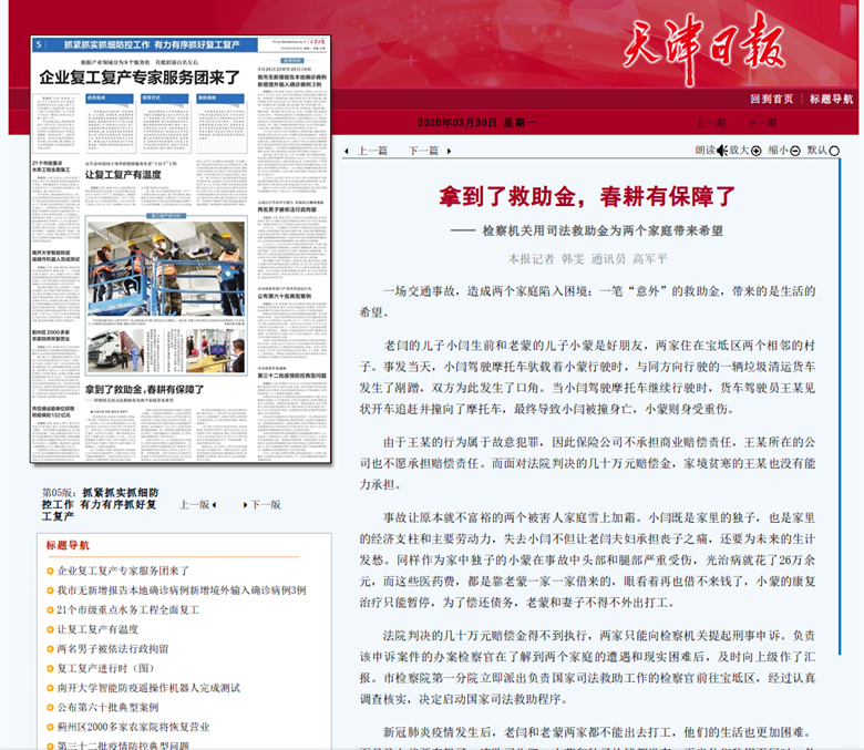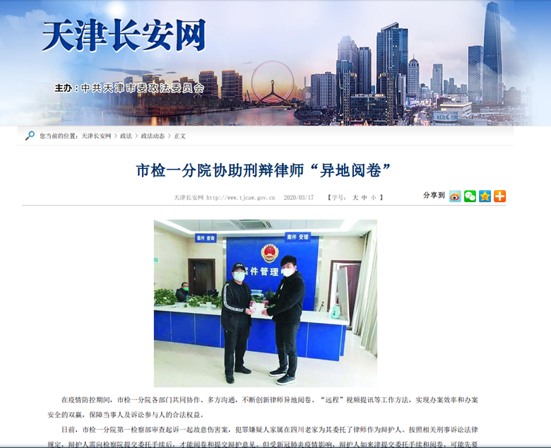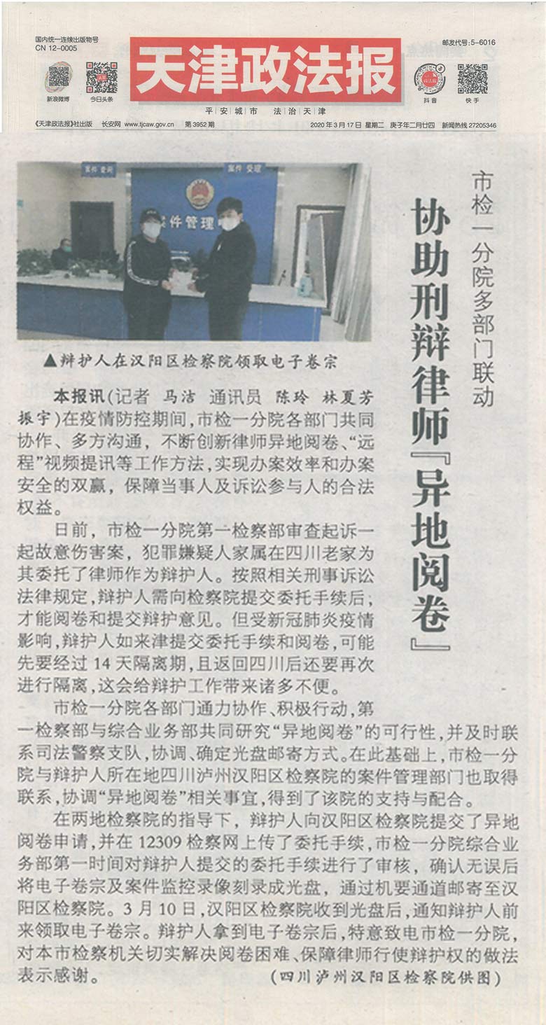 一分院疫情防控期间检察工作宣传稿件被《天津日报》、《天津政法报》、人民网、天津长安网刊载
