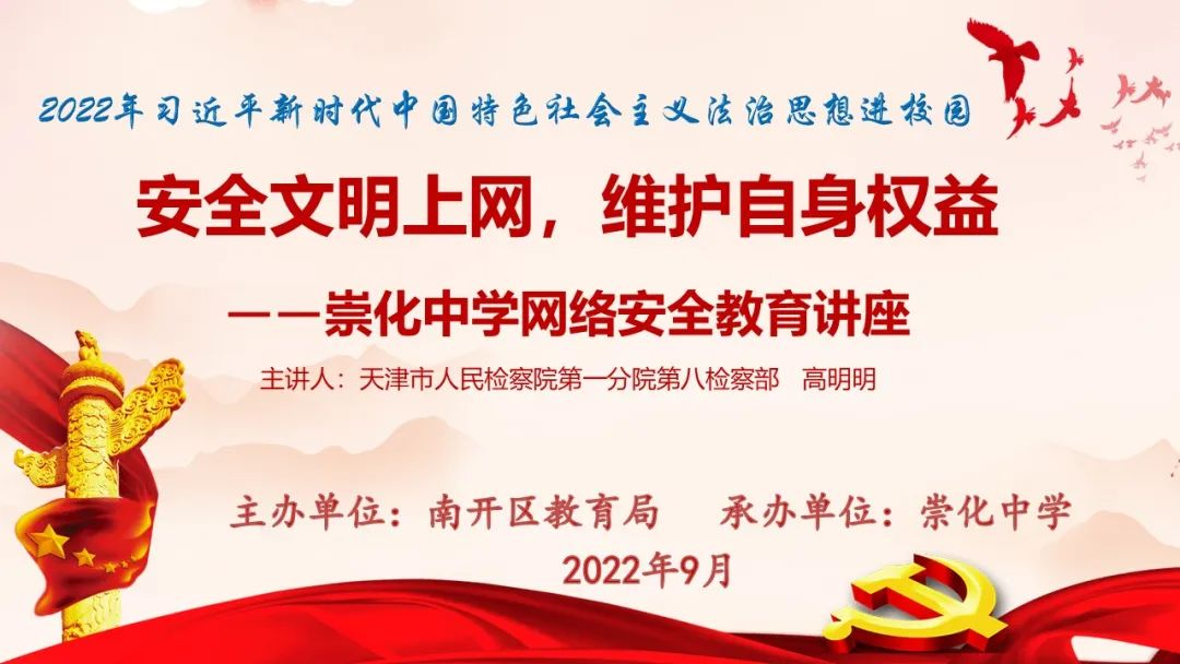 在新学期开始之际,一分院认真组织开展“开学第一课”法治宣讲系列活动。结合国家网络安全宣传周主题,针对学校和家长十分关注的未成年人使用网络安全问题,干警精心准备题为《安全文明上网,维护自身权益》的网络安全讲座视频,以网课形式向南开区崇化中学等学校的学生及家长开展宣讲。