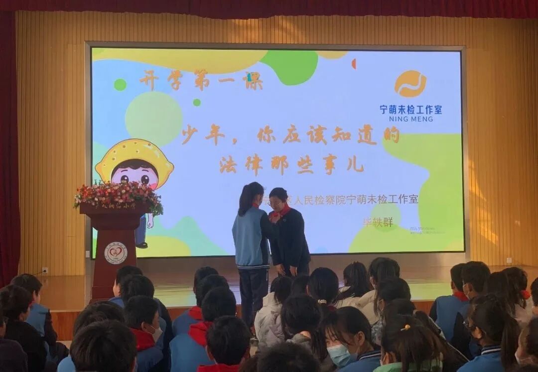 优秀少先队员代表为宁萌检察官戴红领巾,检察官寄语少先队员“少年当有德”“少年当有志”“少年当有力”“少年当自强”。